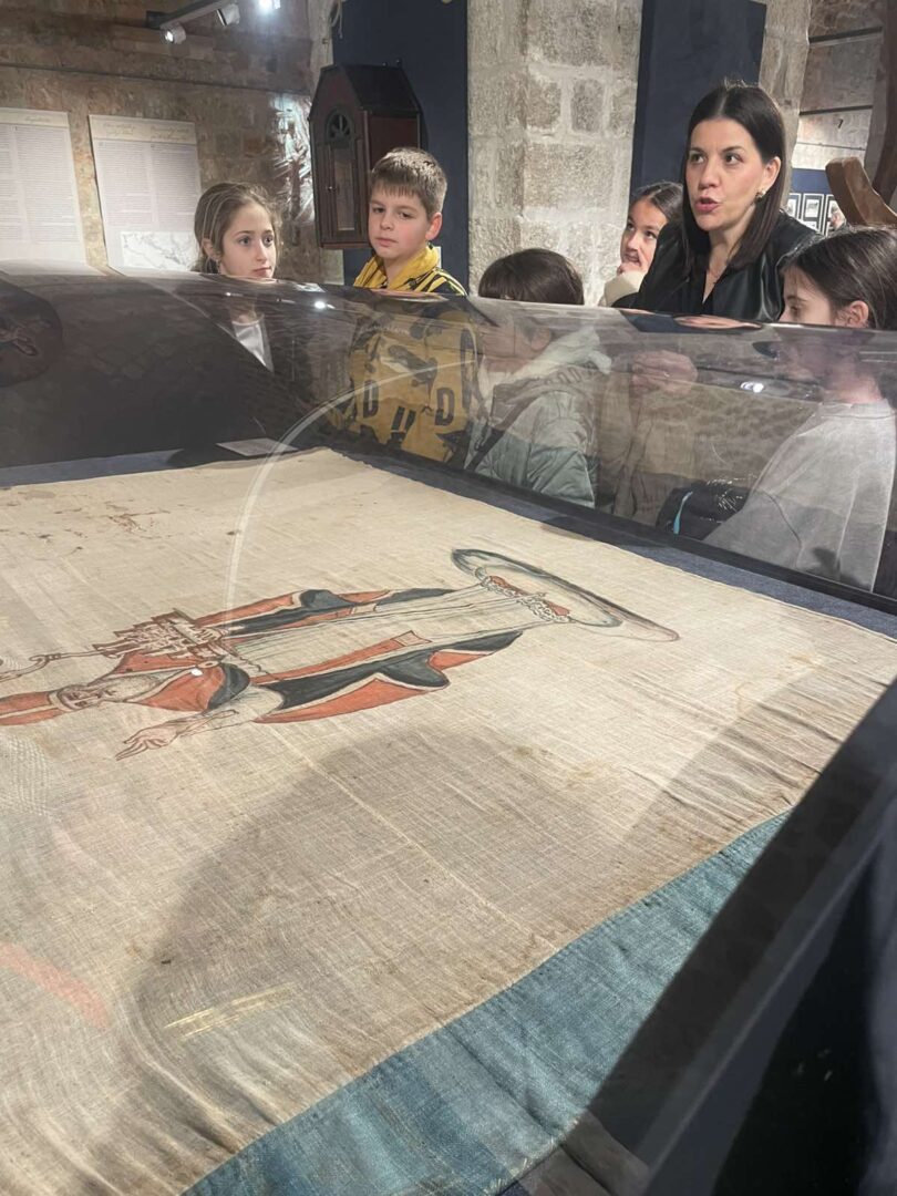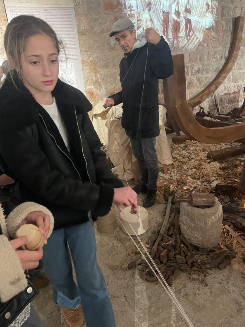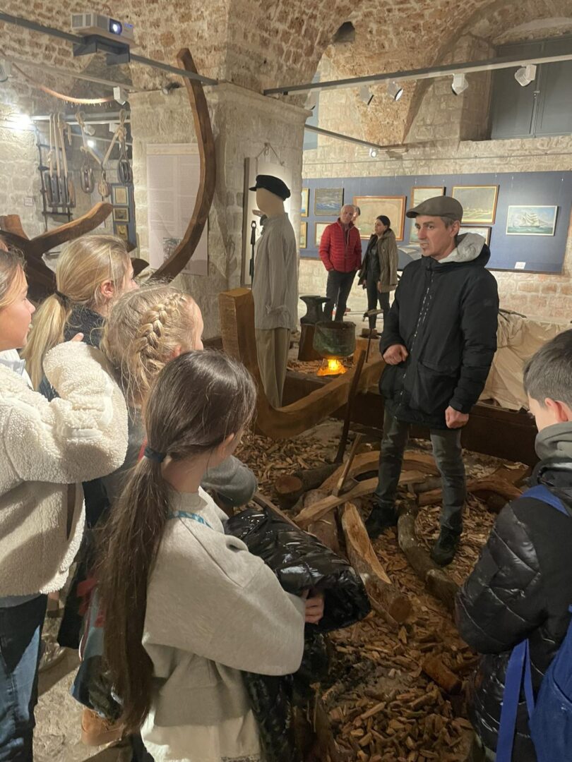 Kustosica Ana detaljno je provela đake kroz izložbu, a dundo Željko ih je naučio kako se pletu konopi, sto su radili kalafati i kako su se mastila jedra.