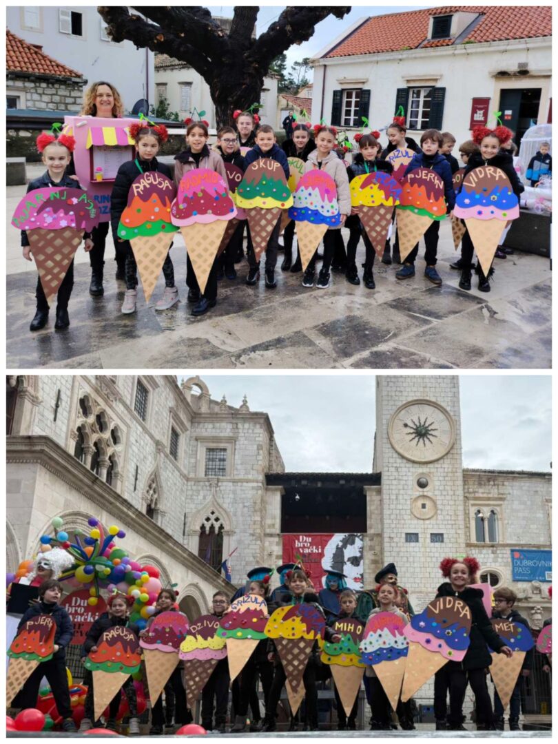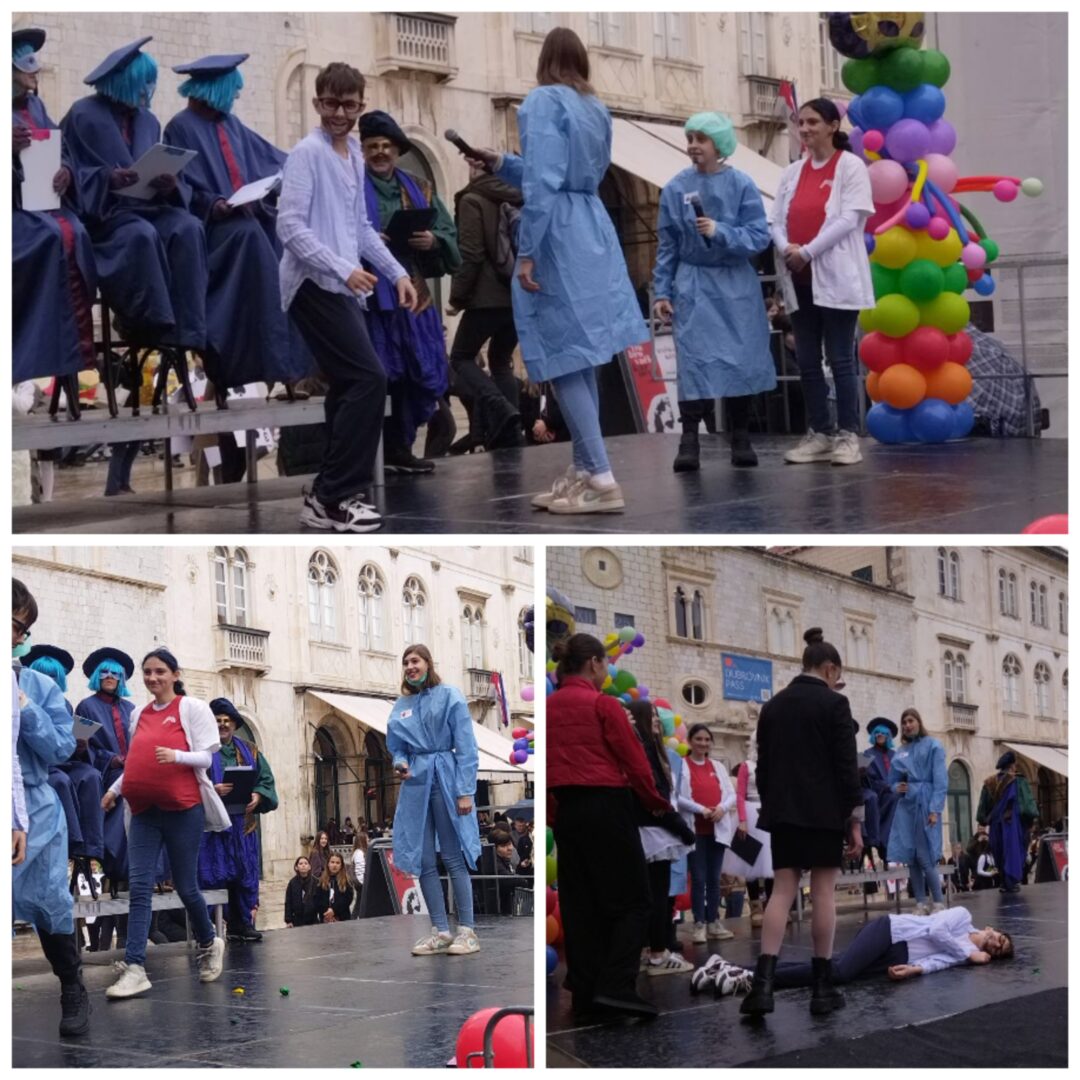 Karnevalsko veselje otvoreno je Maškaranim školskim danom na Stradunu, gdje su u šarenoj povorci sudjelovali učenici osnovnih škola – najprije razredi od prvog do četvrtog, a zatim i učenici od petog do osmog razreda.