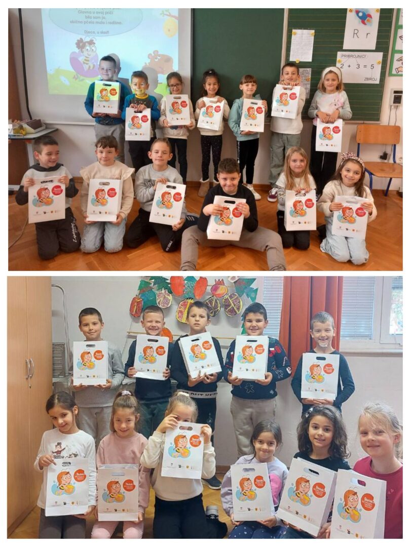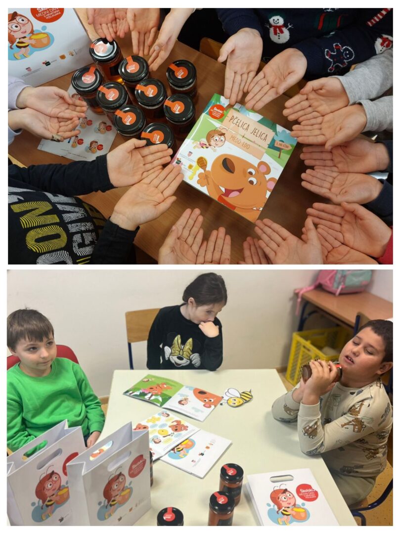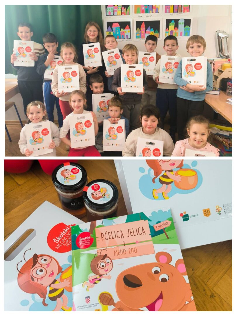 Pomoću slikovnice Pčelica Jelica i medo Edo prvaši su naučili da bez vrijednih pčela nema slasnih i zdravih proizvoda. Dobili su na poklon slikovnicu i staklenku meda s hrvatskih pčelinjaka.